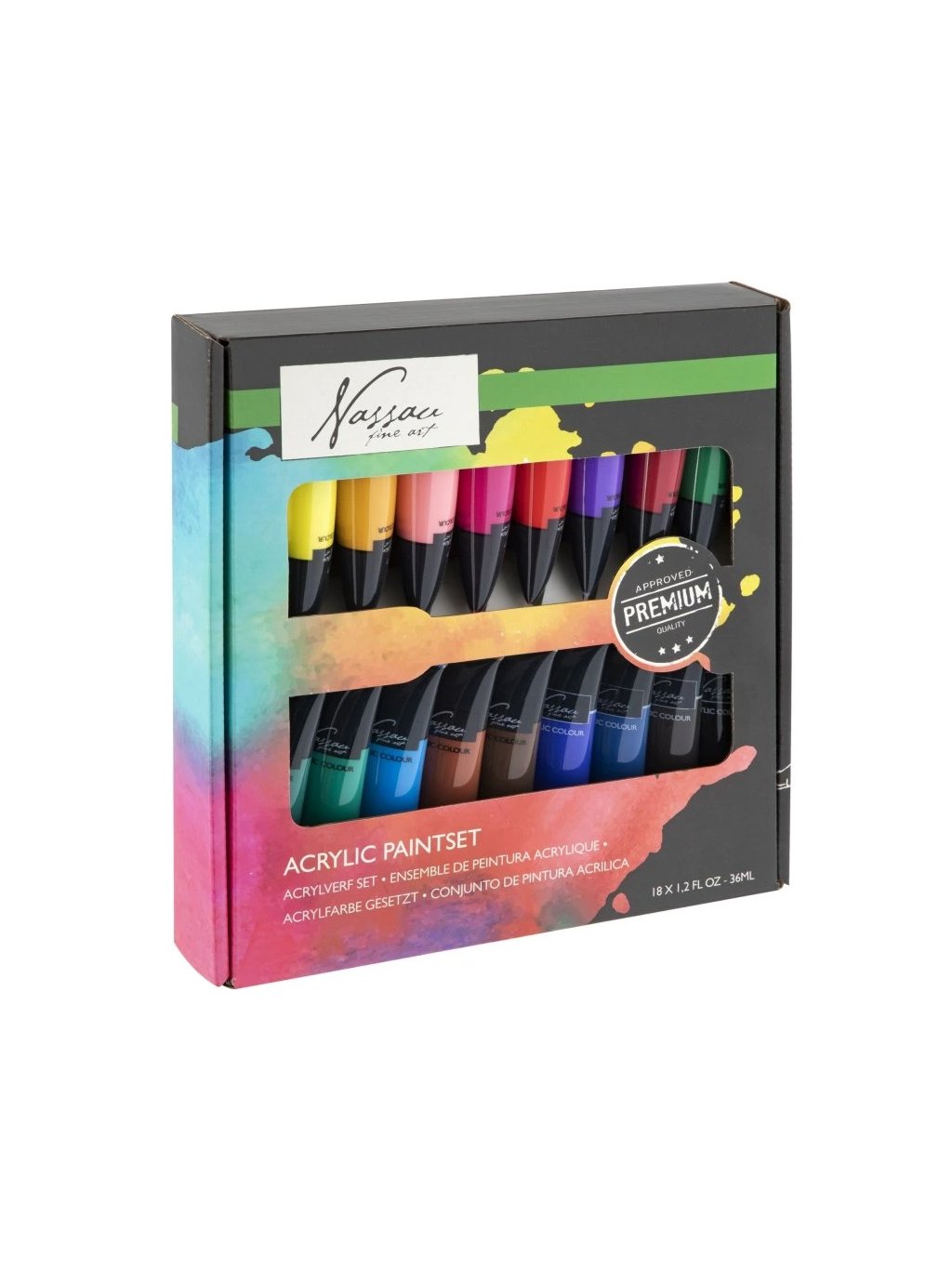 Sada 18 akrylových barev po 36 ml. Intenzivní odstíny, rychlé schnutí a výborné krytí. Ideální pro plátno, papír, dřevo i další povrchy.