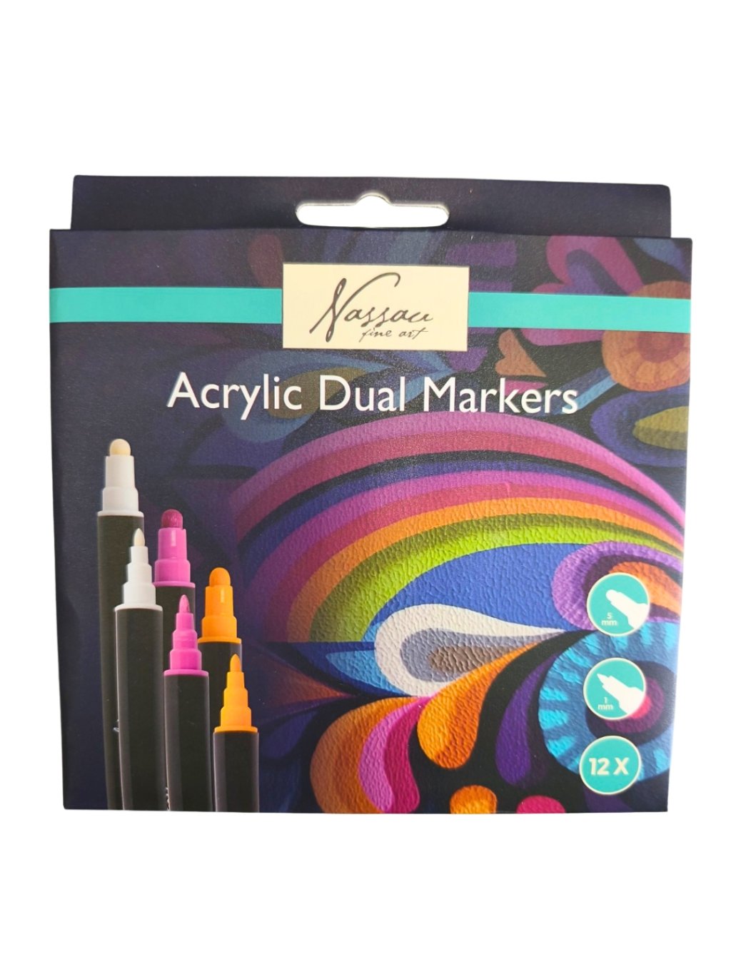 Sada 12 oboustranných akrylových popisovačů se dvěma hroty (cca 1 mm a 5 mm). Vhodné na papír, dřevo, kámen i další povrchy.
