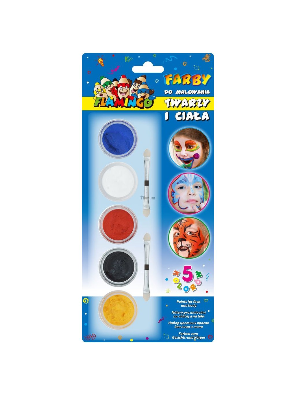 5 ks vodou rozmyvatelných barev na obličej a 2 ks oboustranný aplikátor.