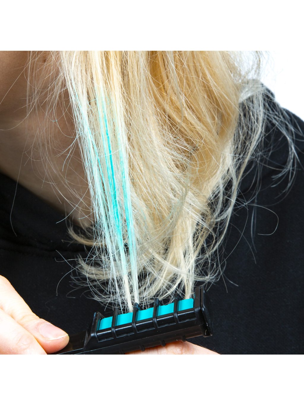 Ve čtyřech jednoduchých krocích na obalu se můžete proměnit v kouzelného lesklého skřítka. Jeden tah hřebenem stačí k obarvení pramenů vlasů v intenzivní barvě, která po několika umytích spadne. Takové jedinečné líčení vás potěší na maškarním večírku, festivalu nebo během Halloweenu. Barvy velmi dobře kryjí, snadno se roztírají a jsou bezpečné pro pokožku, což potvrdily i příslušné laboratorní testy.