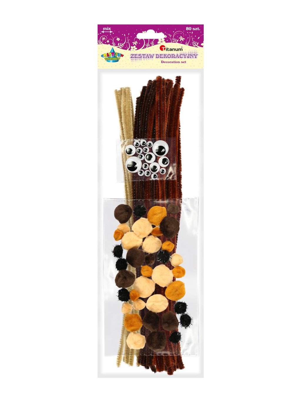Dekorační sada – chlupaté drátky, bambulky a oči, žluto-hnědý mix (80 ks)