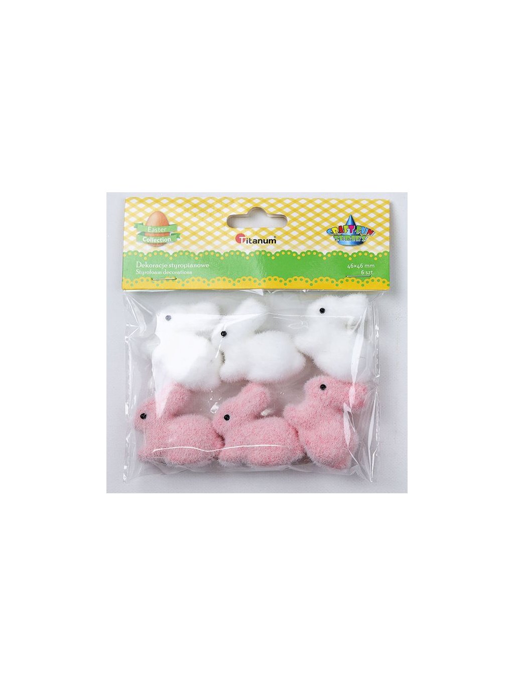 Dekorace králíčků v bílé a růžové barvě. Velikost 46×46 mm. Balení obsahuje 6 ks.
