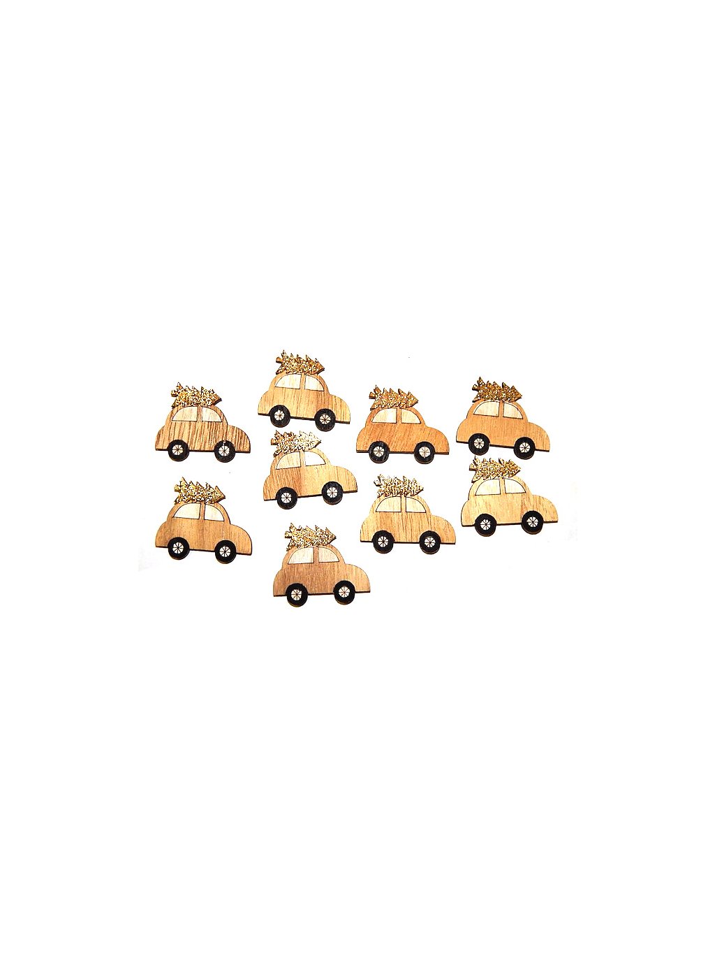 9 ks samolepicích dřevěných dekorací ve tvaru autíčka.