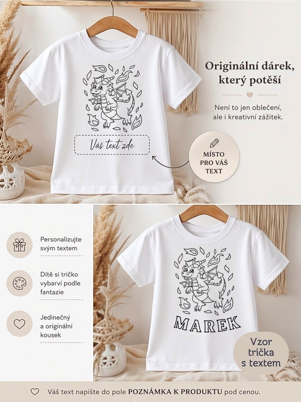 Originální omalovánkové tričko s vlastním textem – dítě si vybarví motiv a doplní jméno či slogan.