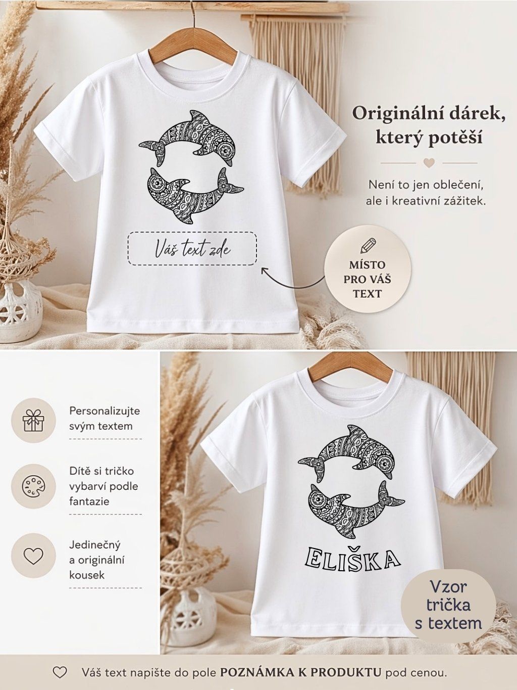 Originální omalovánkové tričko s vlastním textem – dítě si vybarví motiv a doplní jméno či slogan.