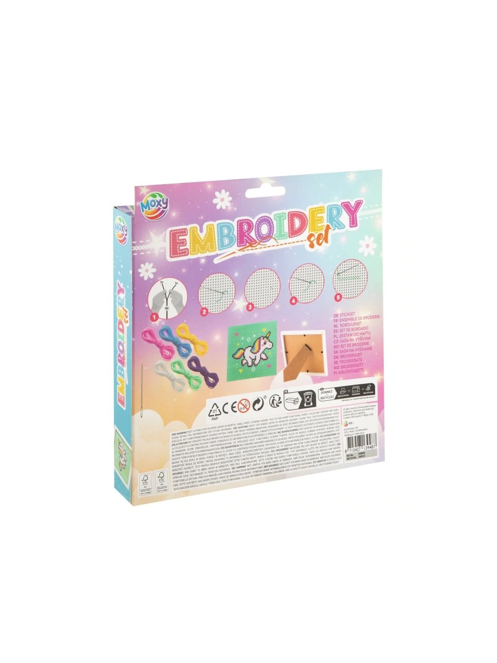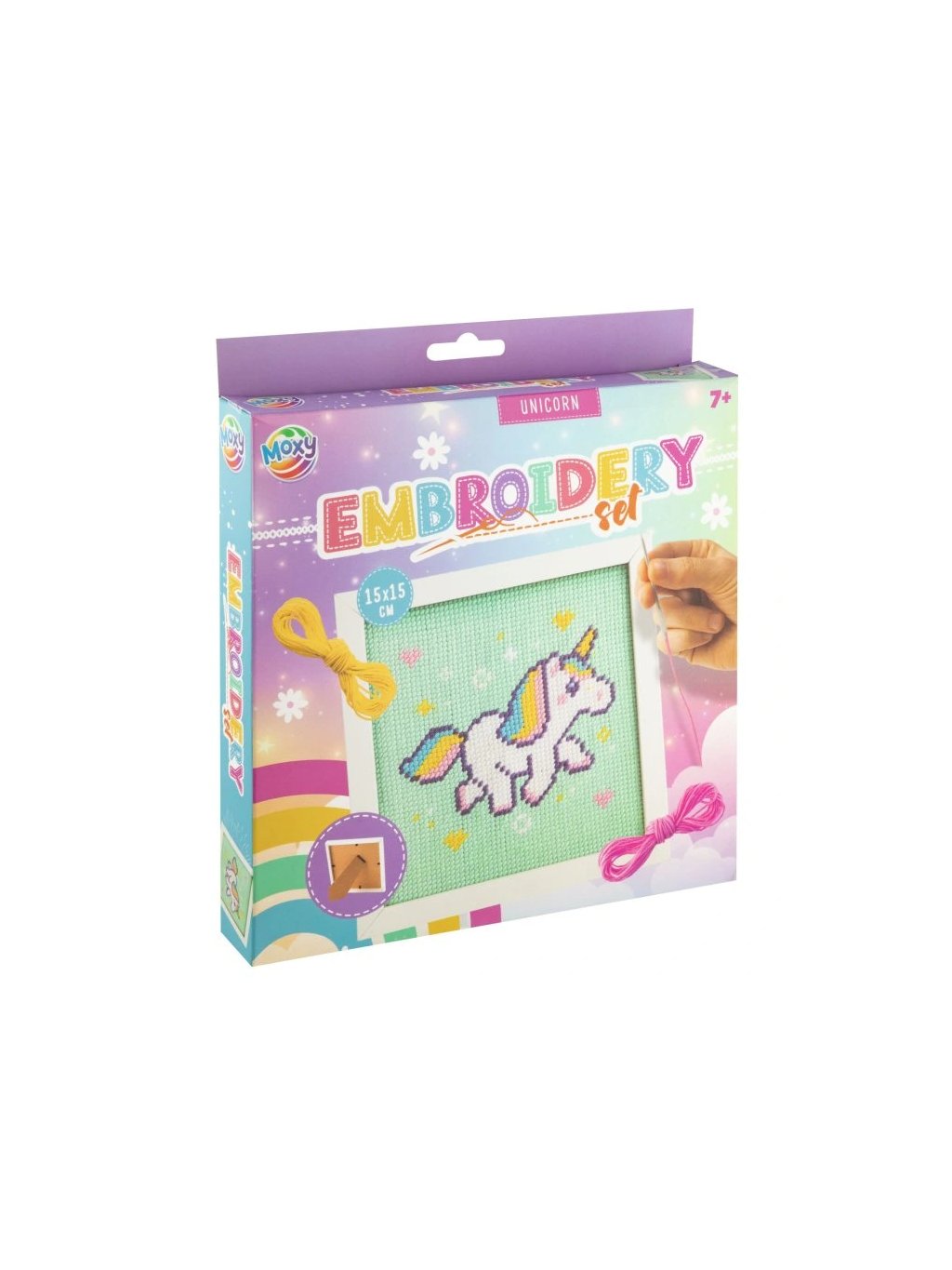 6 bavlnek, vyšívací kovovou jehlu s kulatým hrotem, bílý plastový rámeček se stojánkem 15 x 15 cm. Na zadní straně obaluje je obrázkový návod jak na vyšívání.