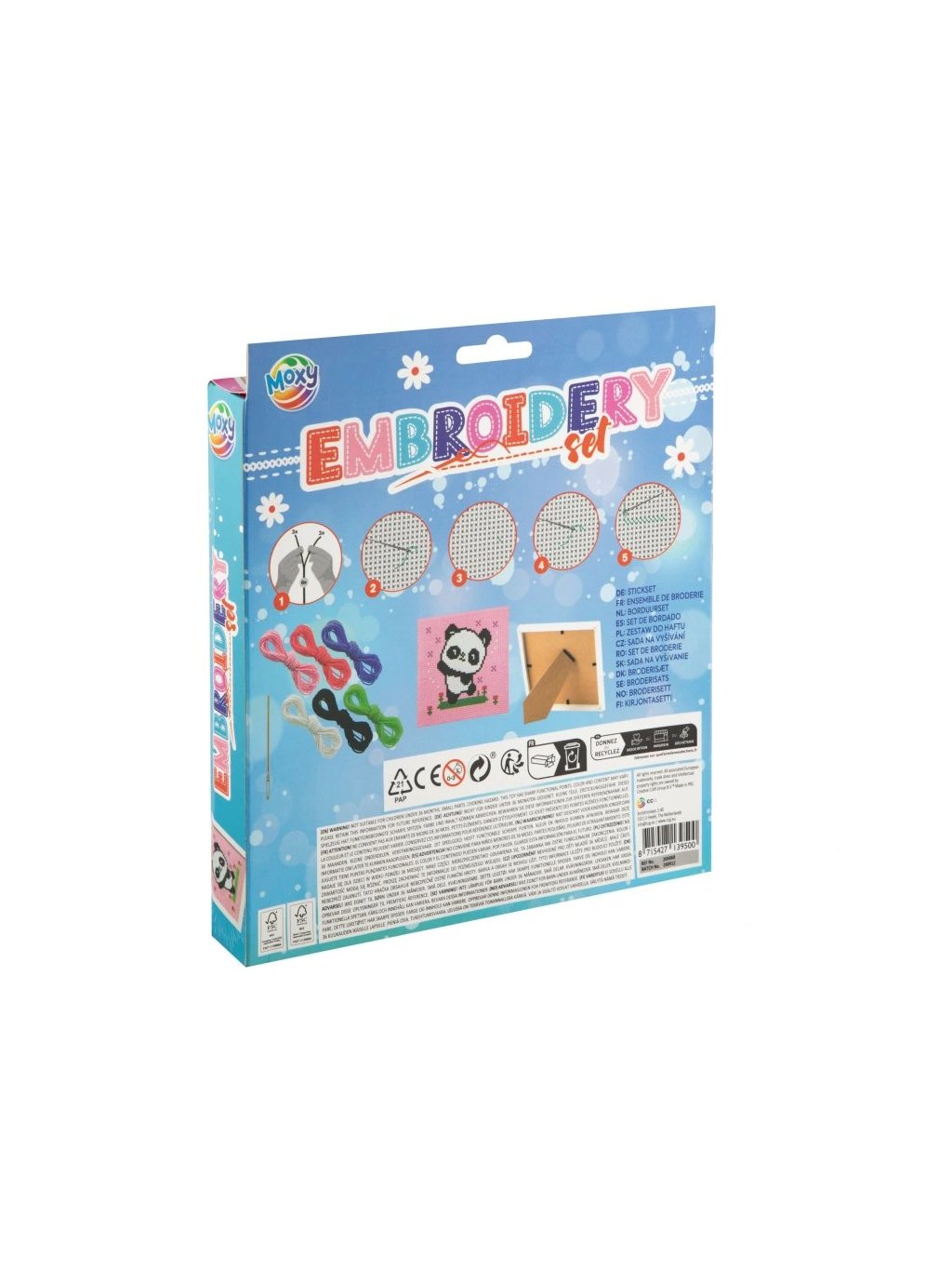 6 bavlnek, vyšívací kovovou jehlu s kulatým hrotem, bílý plastový rámeček se stojánkem 15 x 15 cm. Na zadní straně obaluje je obrázkový návod jak na vyšívání.