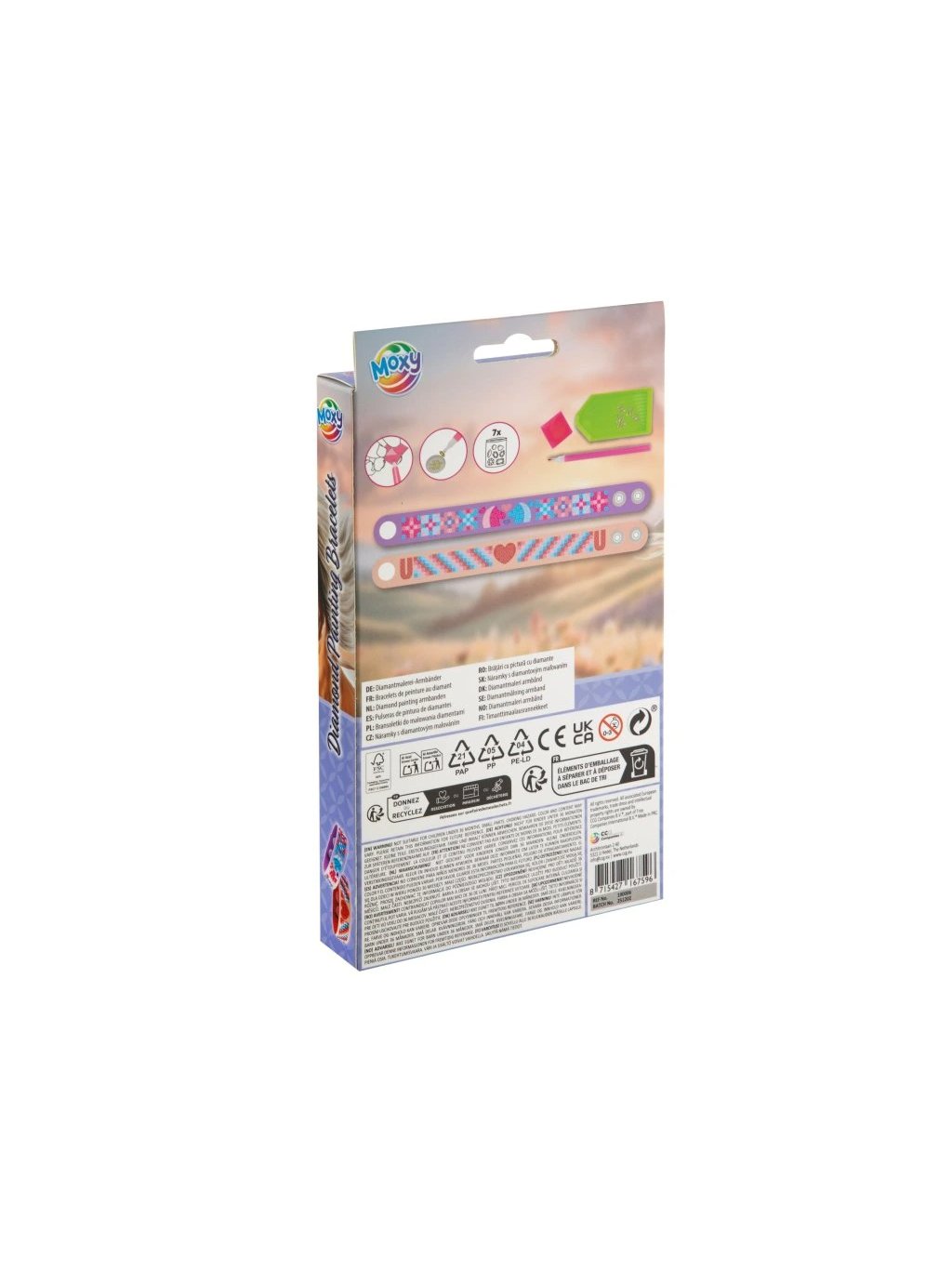 Obsahuje: 2 náramky (růžový, fialový), 7 barev kamínků, 1 pero na aplikaci, 1 kalíšek na vysypání, 1 vosk