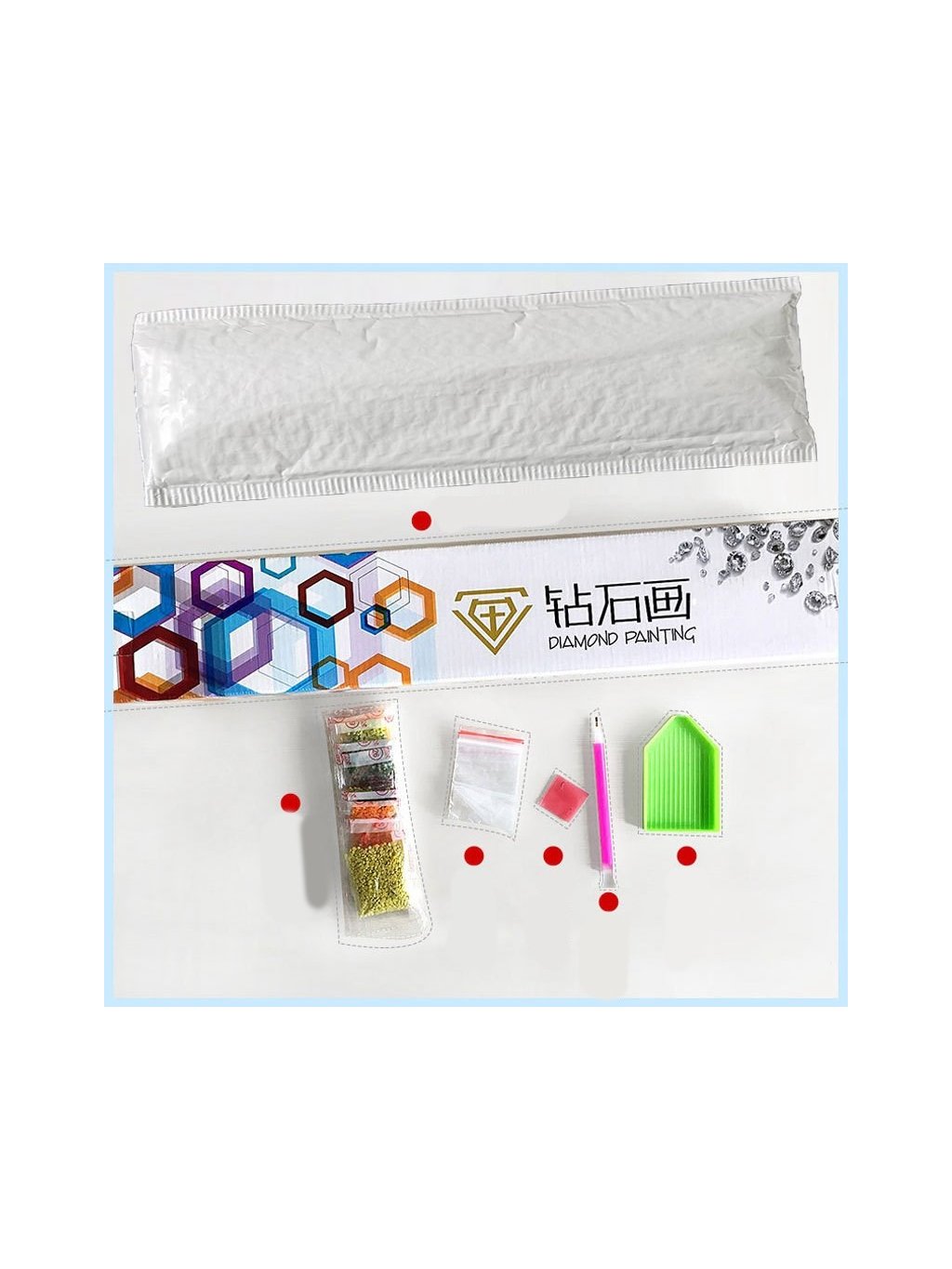 Postup: Obrázek je zakrytý ochrannou folii, kterou sundávejte vždy postupně, tak jak budete aplikovat kamínky.Při sundání celé folie najednou hrozí, že se ztratí viskozita lepidla a kamínky nebudou držet. Plátno obsahuje označení, která jsou umístěna i na sáčcích s kamínky. Podle označení, víte kam který kamínek patří. Nejprve si do hrotu tužky naberete vosk,díky kterému se kamínky snadno přichytí na pero. Kamínky perem aplikujete na obrázek. Hotový obraz lze zarámovat- rám není součástí balení.