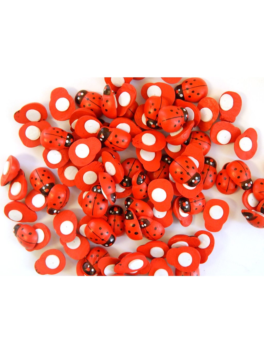 Dřevěné berušky mají na spodní straně samolepicí pěnovou tečku.