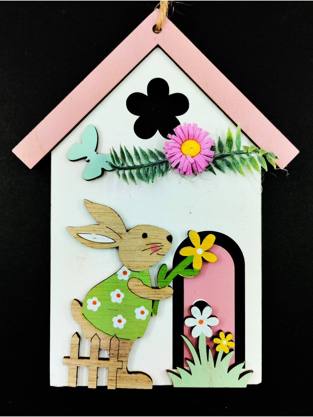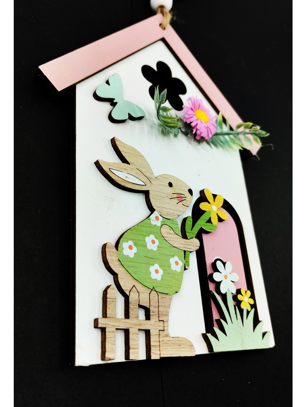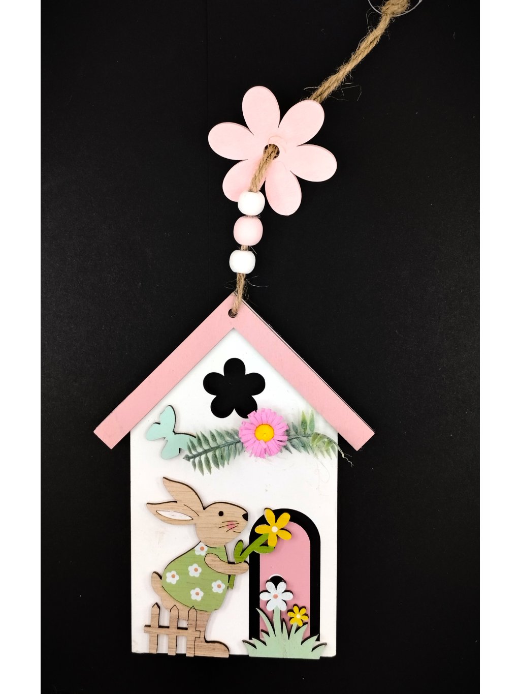 Dřevěný závěsný domeček se zajíčkem a růžovou kytičkou na domečku.