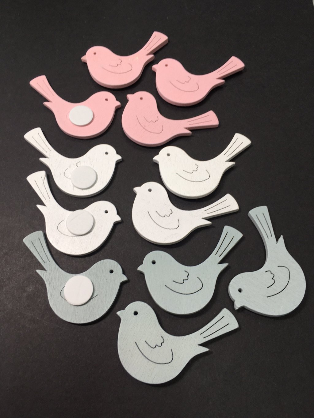 Dřevěná dekorace, ptáček mix, samolepící, 12ks/bal.