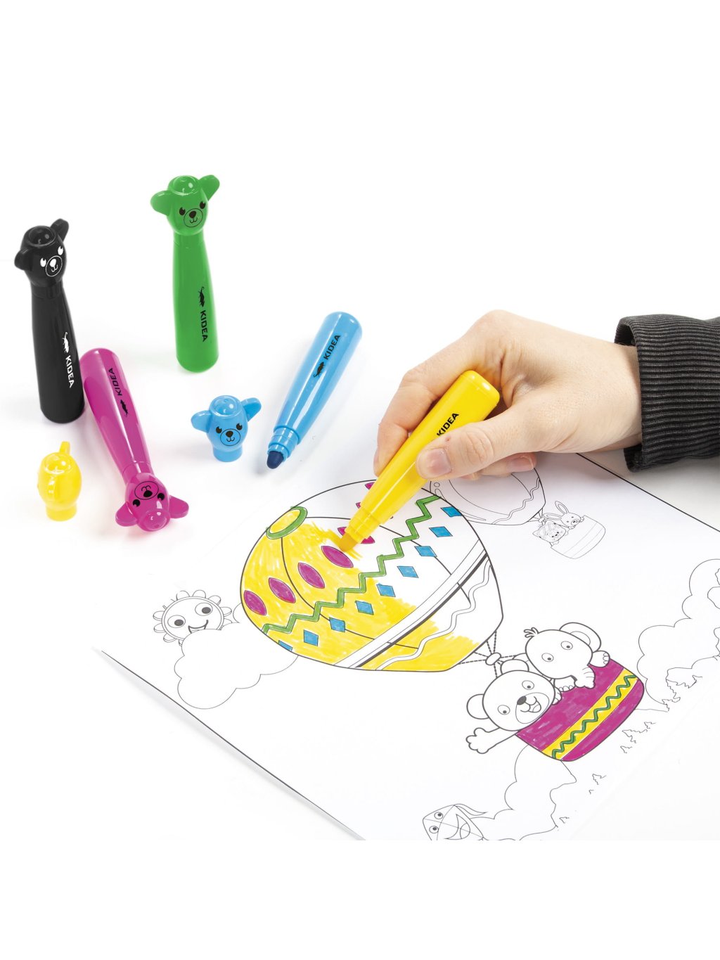 Jumbo fixy s figurkou medvěda v šesti intenzivních barvách: černá, červená, žlutá, zelená, modrá a růžová.