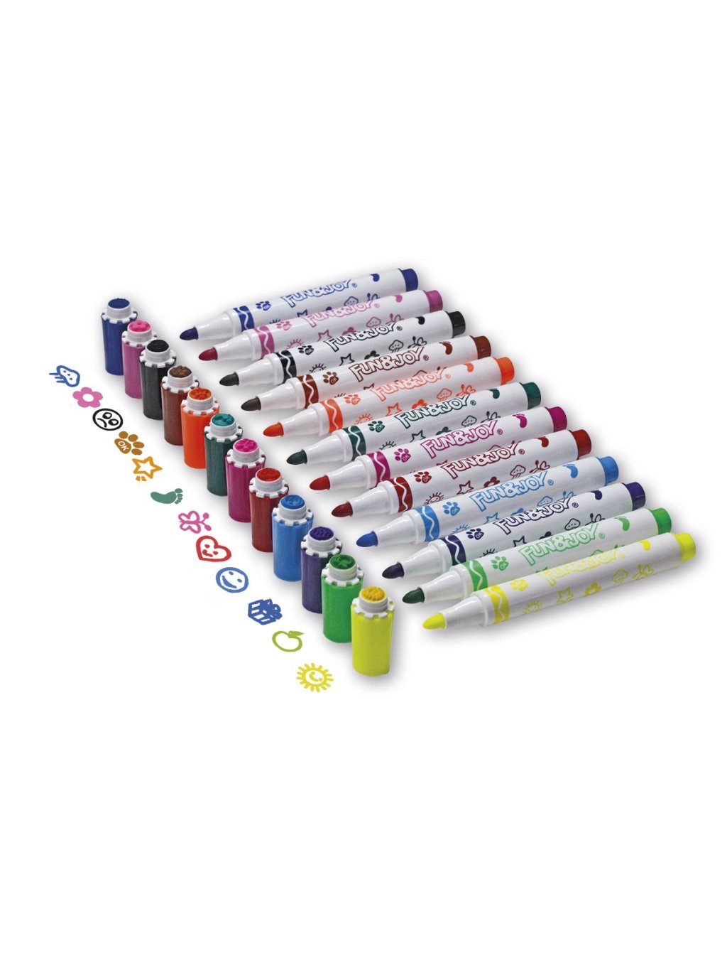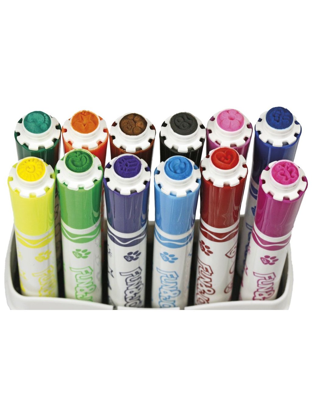 Sada 12 fixů v intenzivních, velmi šťavnatých, jasných barvách. Se zábavnými mini razítky integrovanými do každého uzávěru. Je to ideální nabídka pro děti, které standardní fixy nudí. Perfektní pro kreslení, zdobení a zdobení pozvánek, přání a vavřínů.