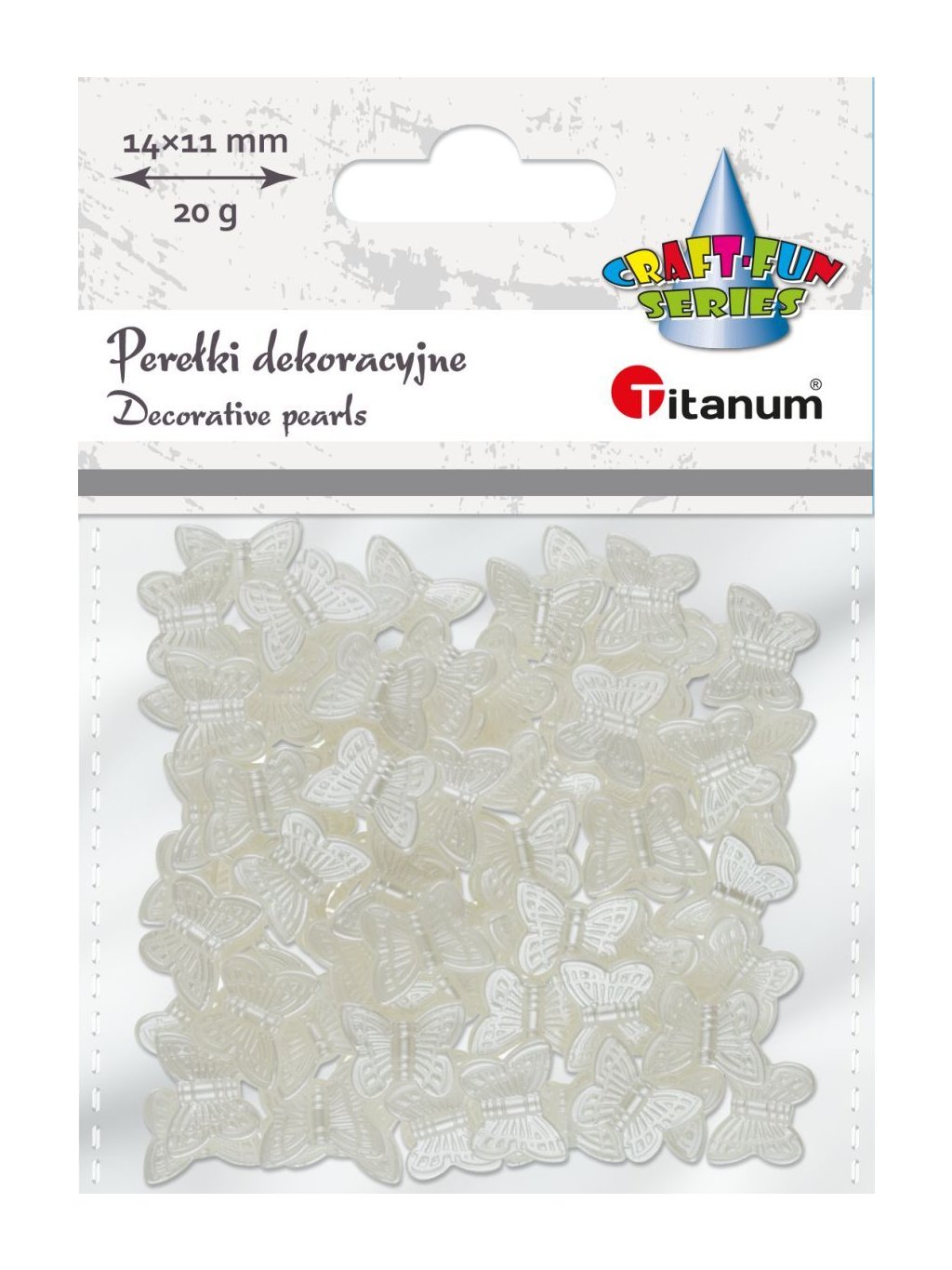 Plastové korálky ve tvaru motýlů. Bílá barva, velikost 14×11 mm, balení 20 g.