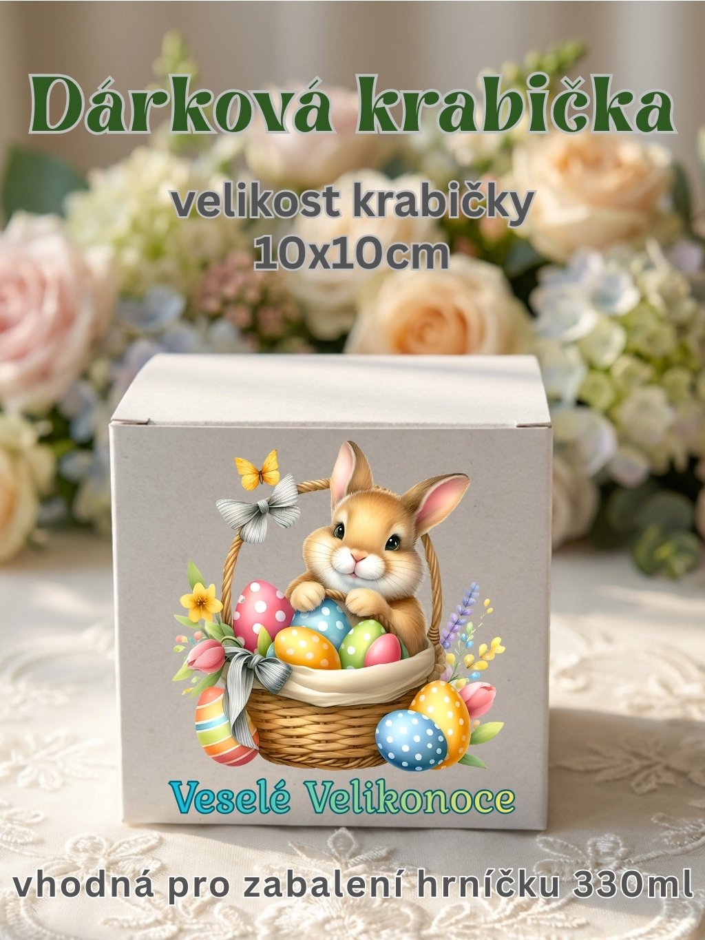 Dárková krabička 10×10×10 cm s potiskem VESELÉ VELIKONOCE. Ideální na malé dárky i hrnek 330 ml. Z bílého kartonu, dodávána v rozloženém stavu.