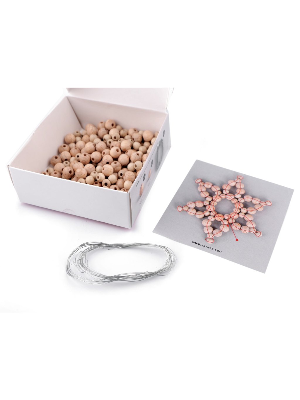 Kreativní sada na výrobu 3 dekoračních vloček z dřevěných korálků vás bude bavit. Je to snadné, stačí se orientovat přiloženým schématem navlékání.