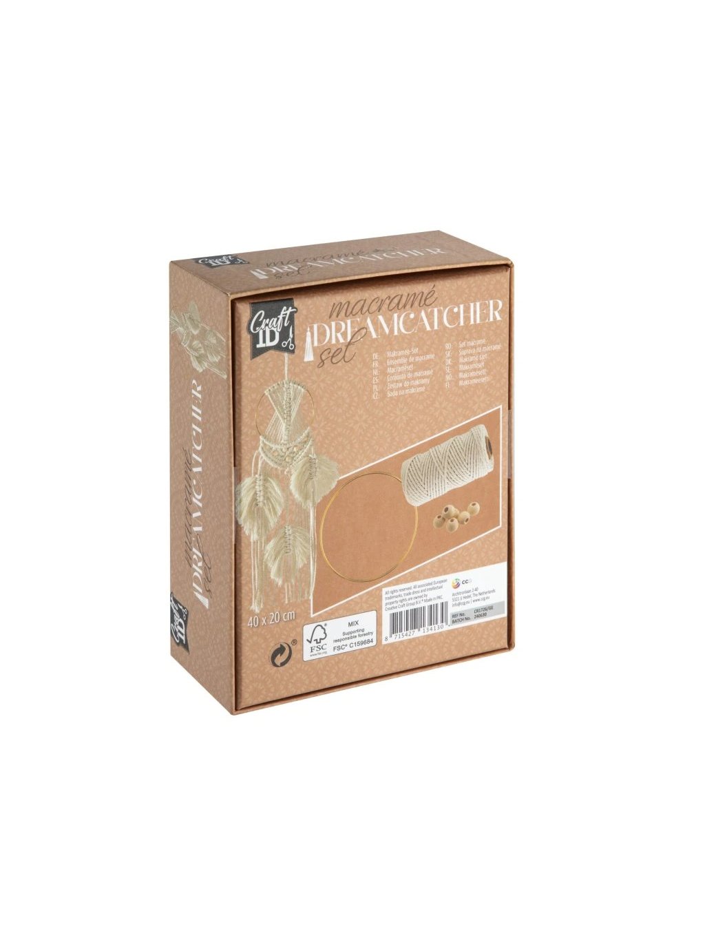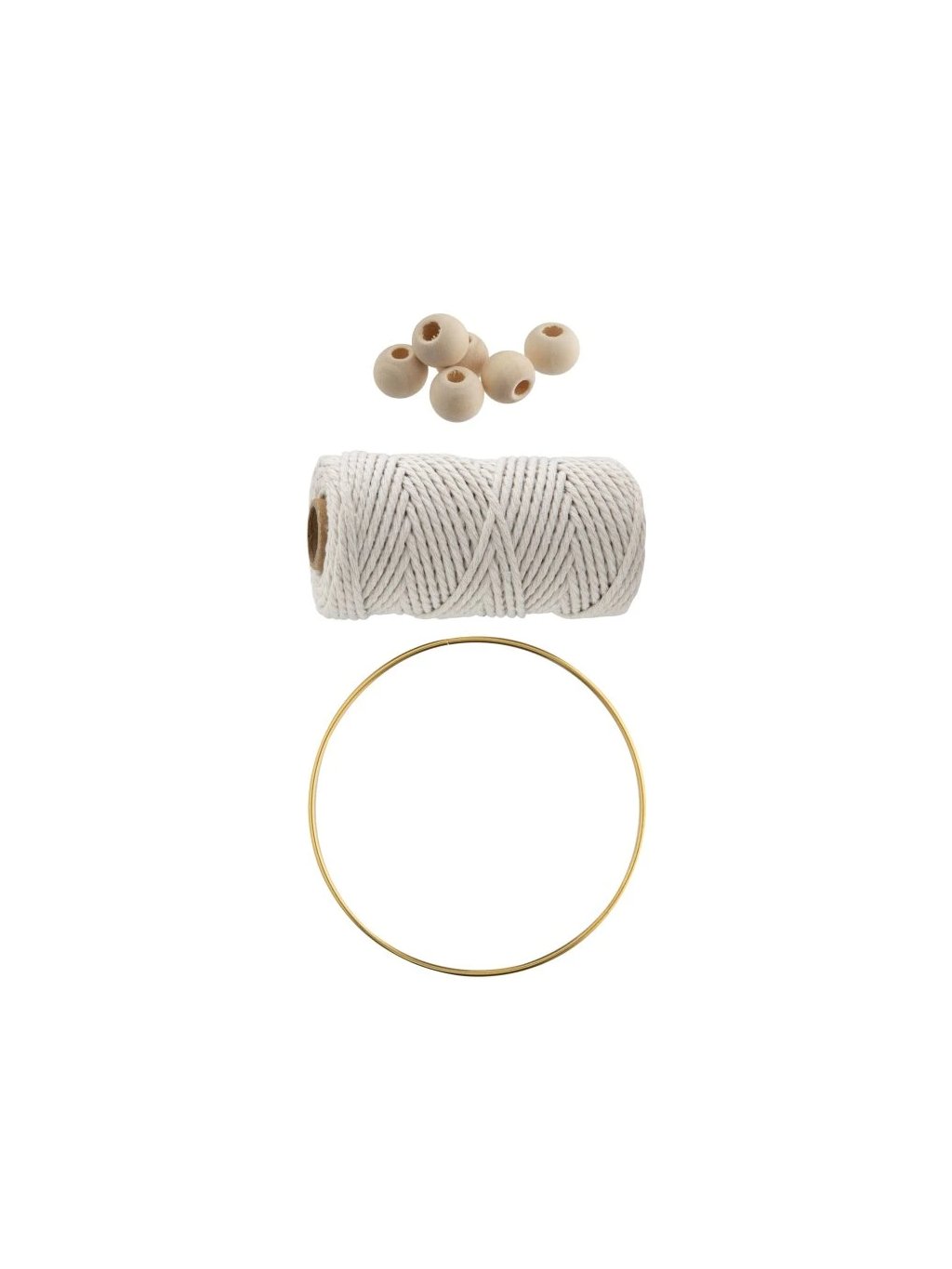 DIY sada na výrobu makramé lapače snů o velikosti 40 × 20 cm. Obsahuje provázek, korálky, kovový kruh a obrázkový návod.