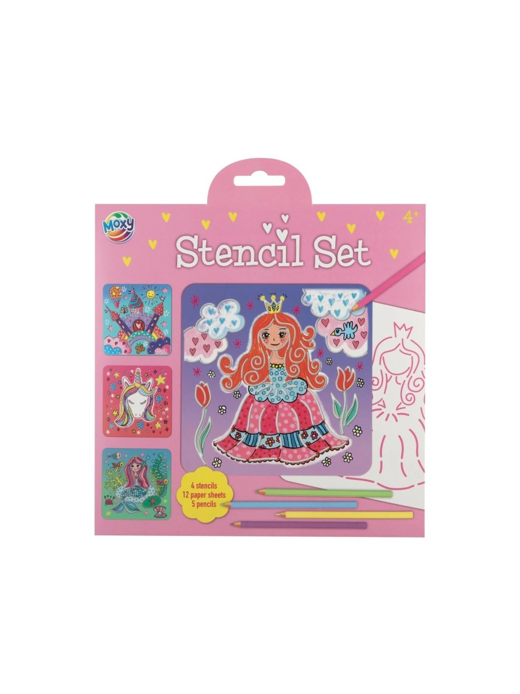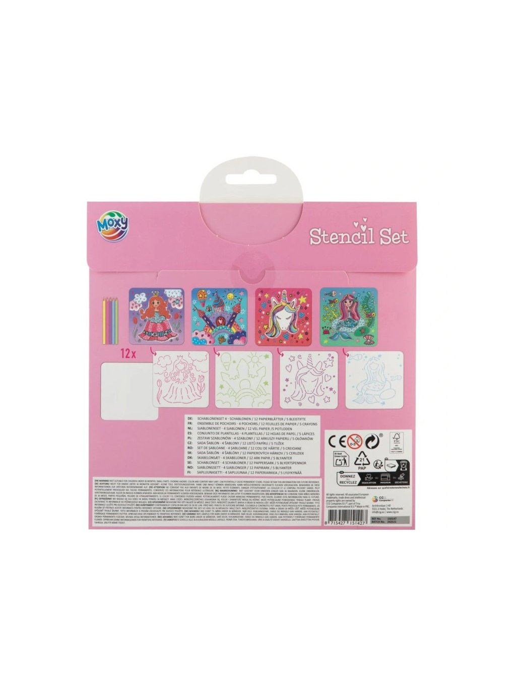 Balení obsahuje 4 různé šablony, 5 pastelek, 12 listů papíru