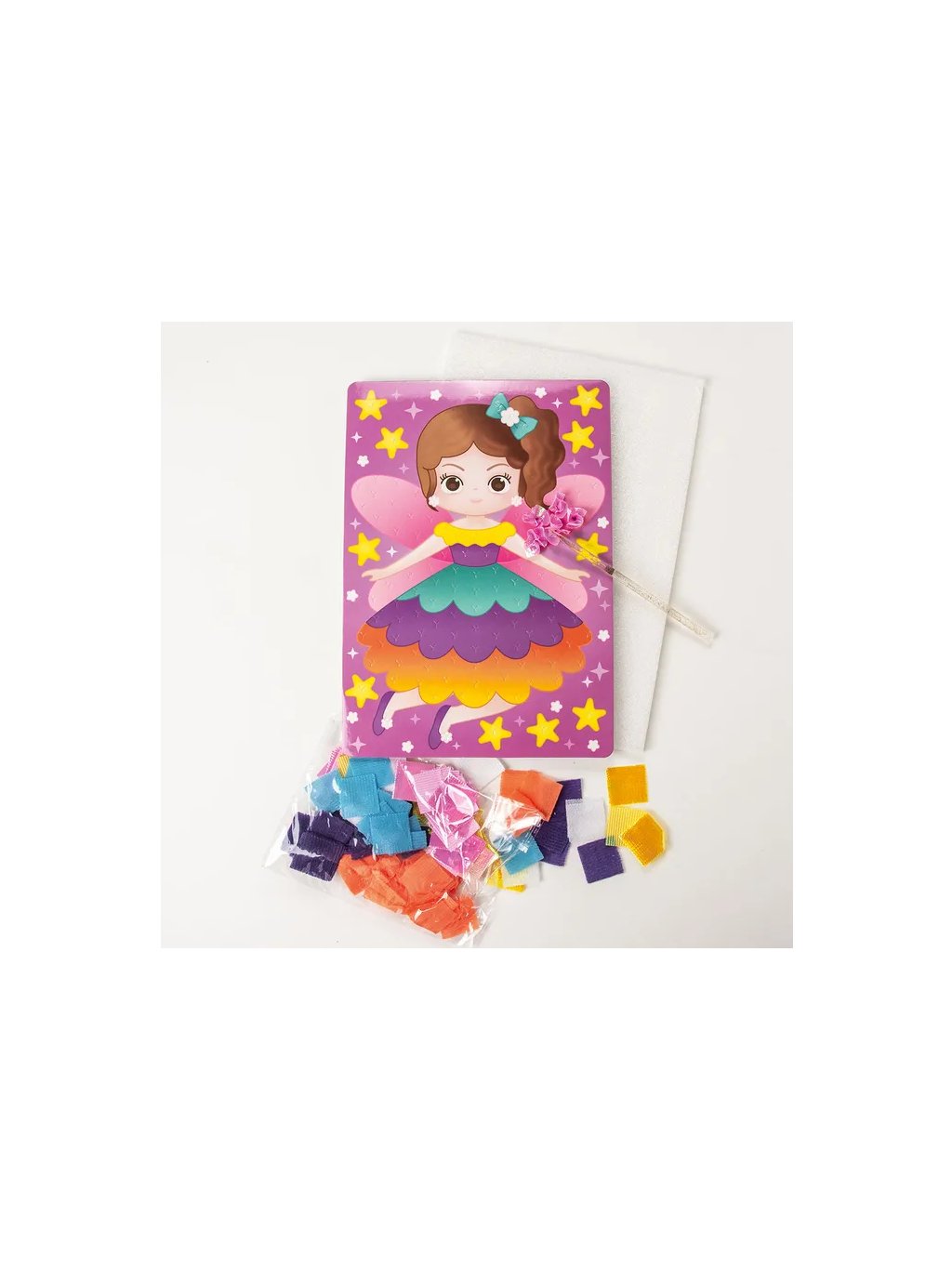 * kreativní sada obsahuje barevnou pěnovou podložku, kousky barevné látky ve tvaru malých čtverců, plastovou jehlu s typovým hrotem