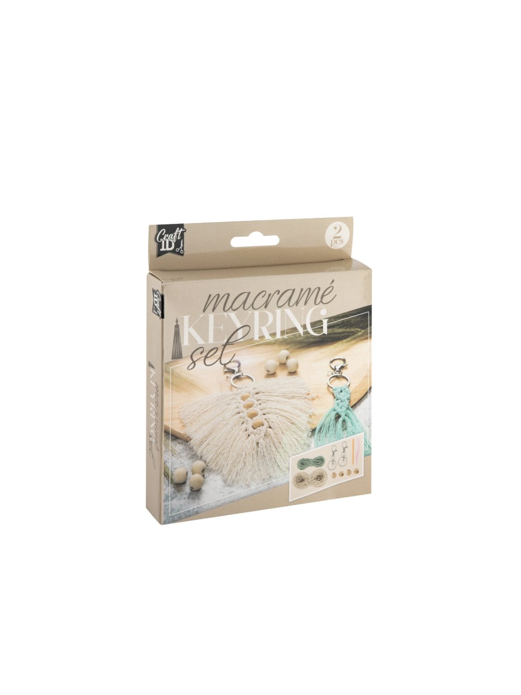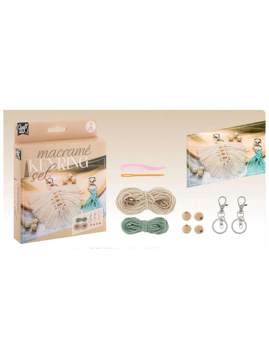 DIY sada na výrobu 2 makramé klíčenek v boho stylu. Obsahuje provázky, korálky, kovové karabinky a návod.