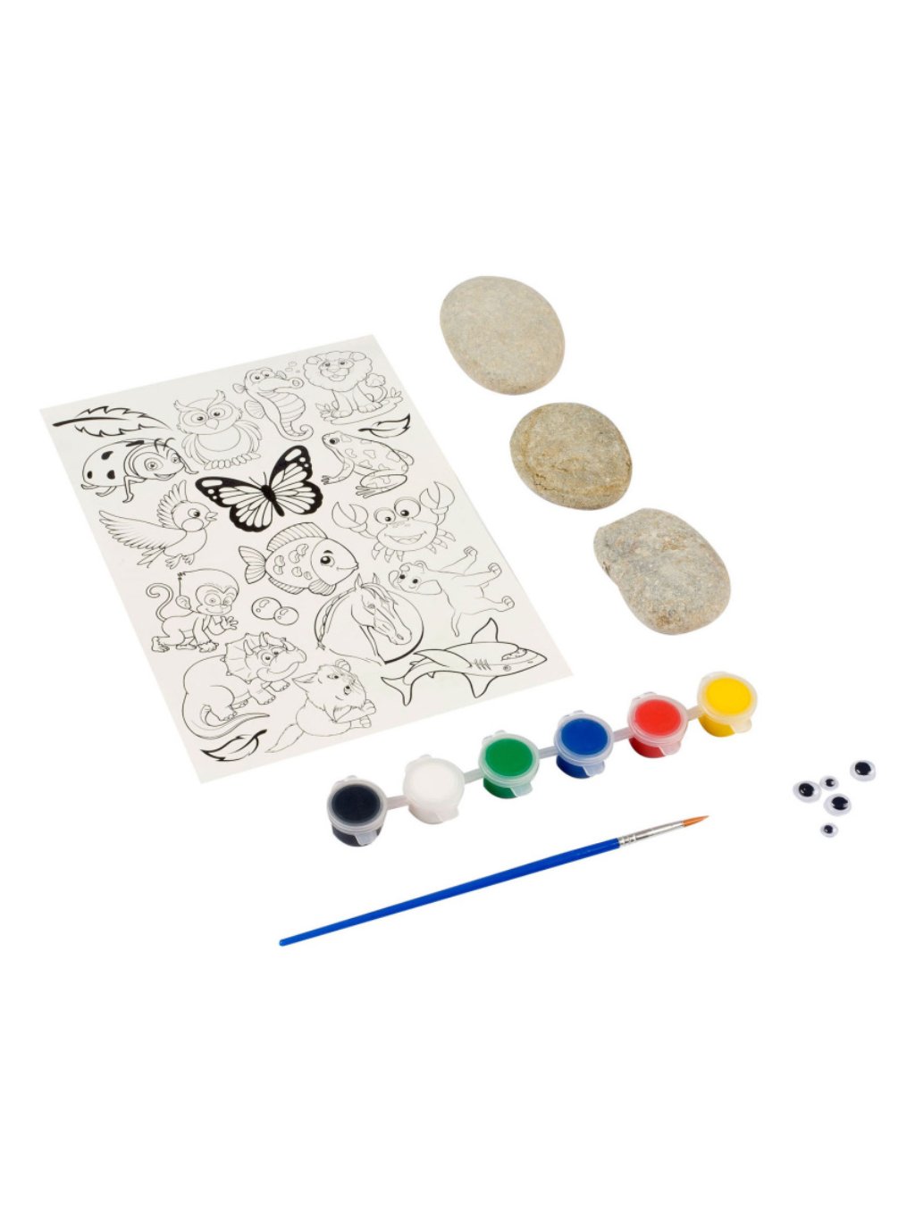 Sada pro malování kamenů. Nalepte na kámen některou z přiložených samolepek nebo na kámen namalujte vlastnoruční malbu. Sada se skládá ze tří kamenů, šesti barven, štětce, archu samolepek a šest očí.
