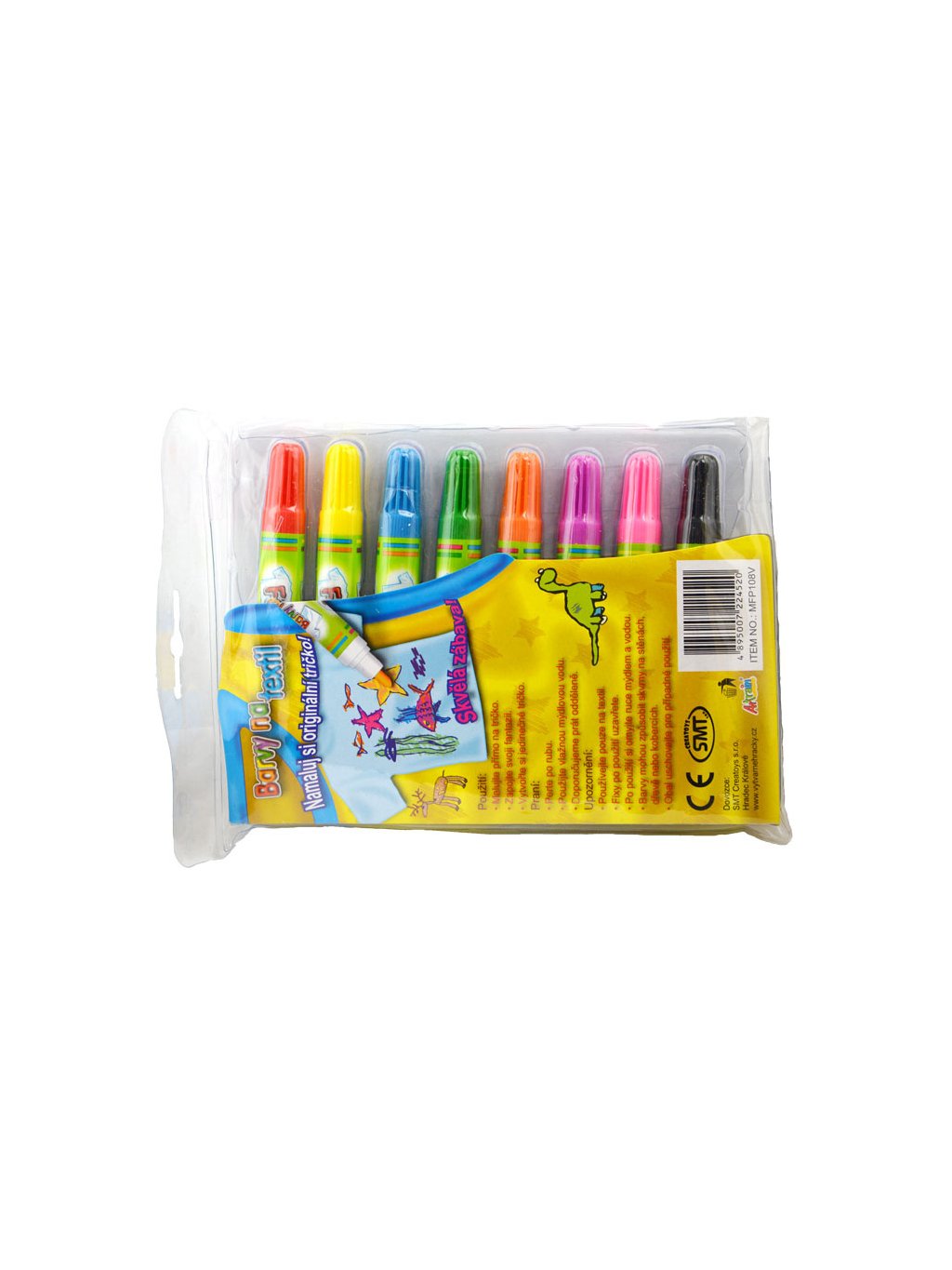 Balení obsahuje: 8 ks tužek na textil - červená, žlutá, modrá, zelená, oranžová, fialová, růžová, černá.