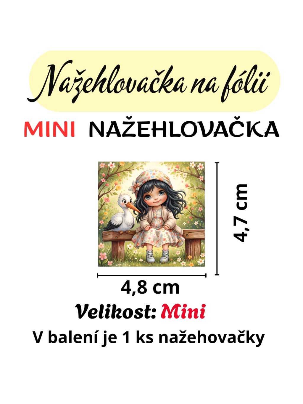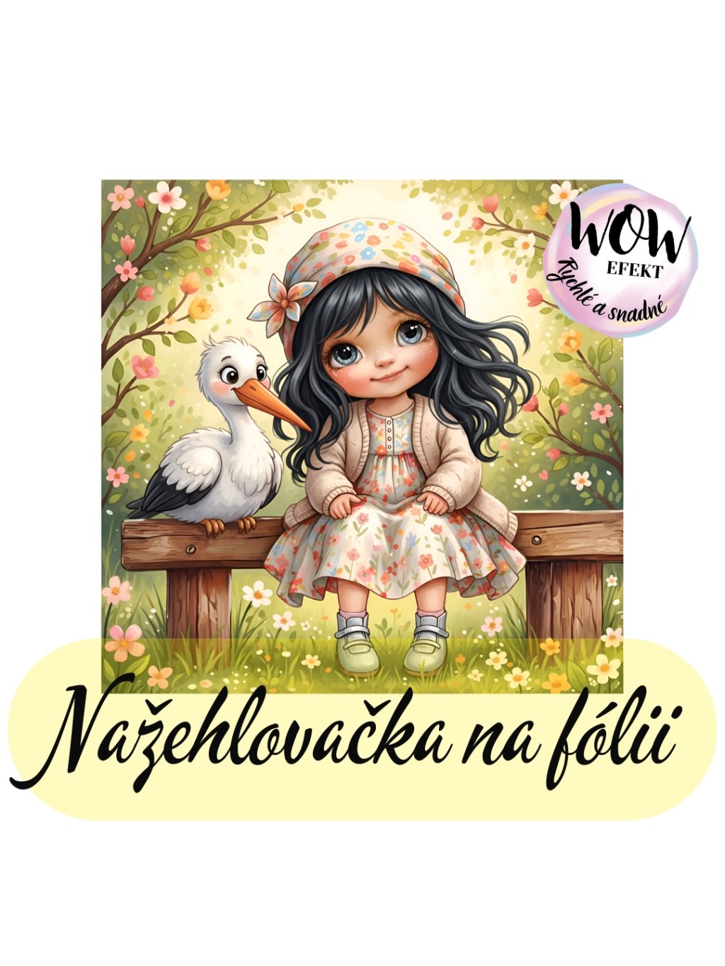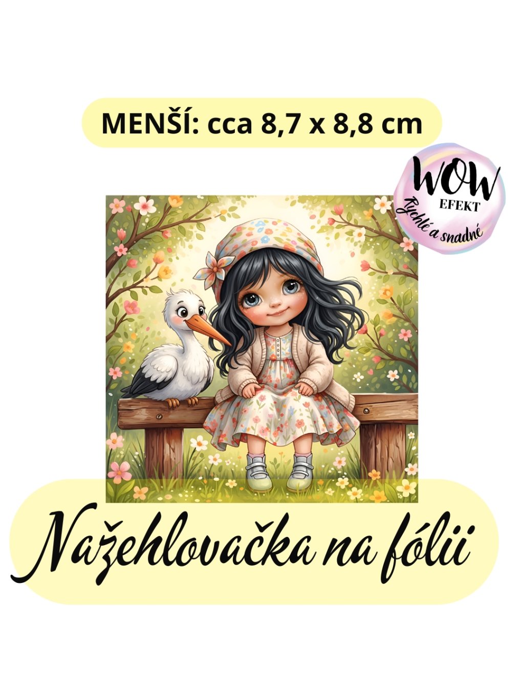 Nažehlovačka na fólii, HOLČIČKA s čápem - jarní- černovláska, 1 kus