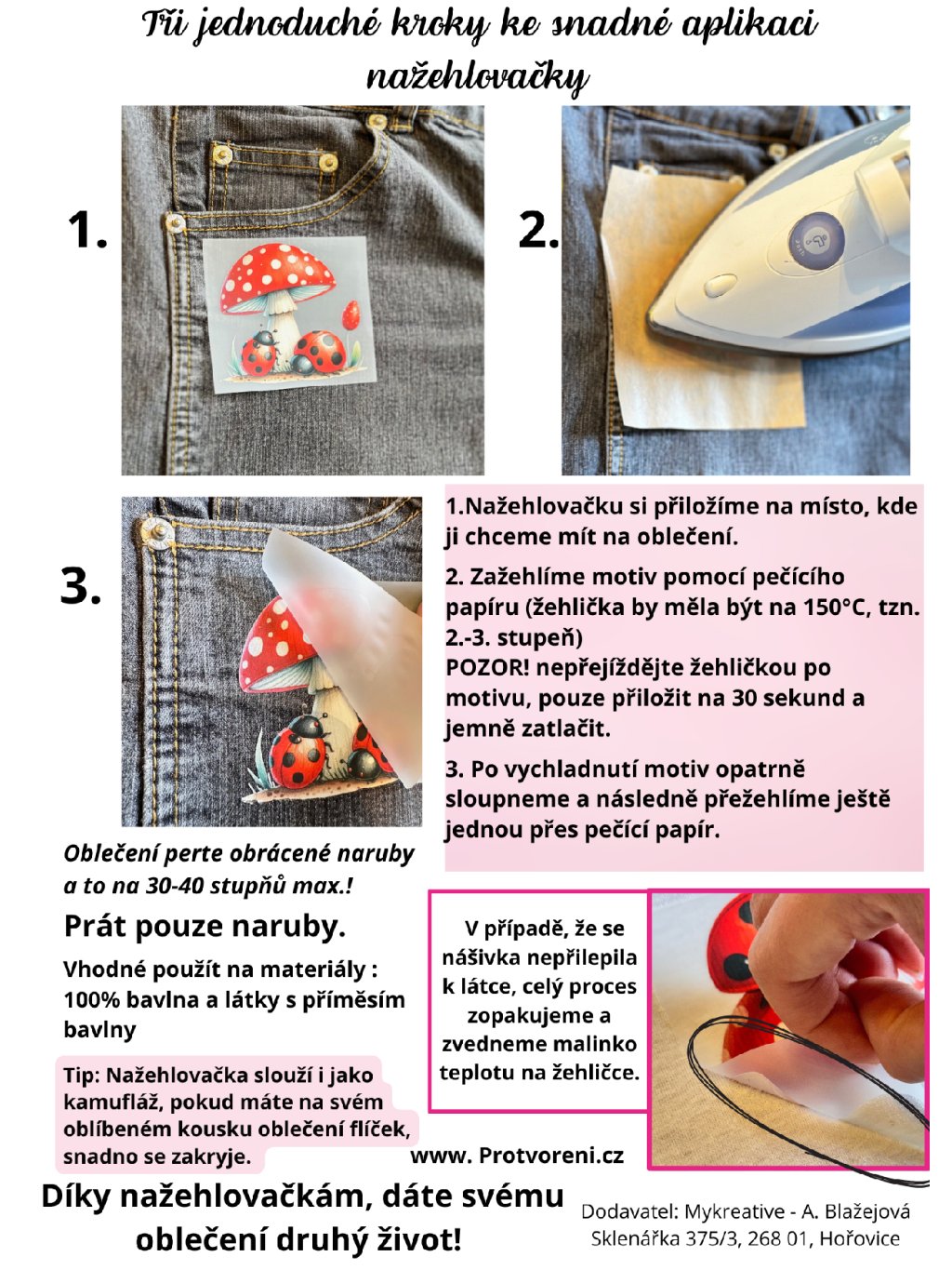 POZOR! nepřejíždějte žehličkou po motivu, pouze přiložit a jemně přitlačit na 30 sekund.