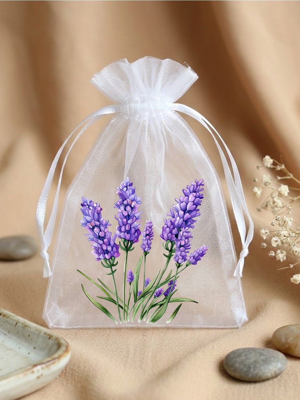Organza dárkový pytlíček, levandule, 7,7 × 10 cm – bílý