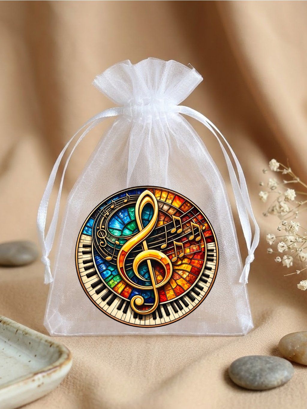 Organza dárkový pytlíček, mandala -Hudba, 7,7 × 10 cm – bílý