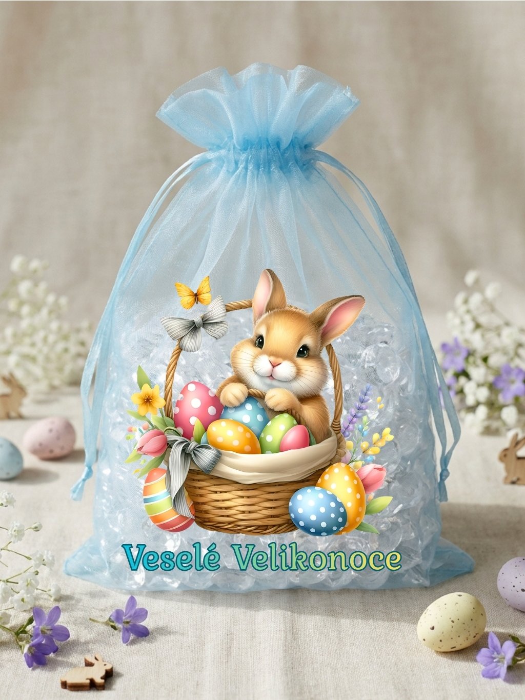 Dodejte svým velikonočním dárkům jemnost a sváteční atmosféru s elegantním organzovým pytlíkem ve světle modré barvě s nápisem Veselé Velikonoce a roztomilým motivem králíčků v košíku. Průsvitný materiál působí slavnostně a decentně zvýrazní obsah uvnitř.