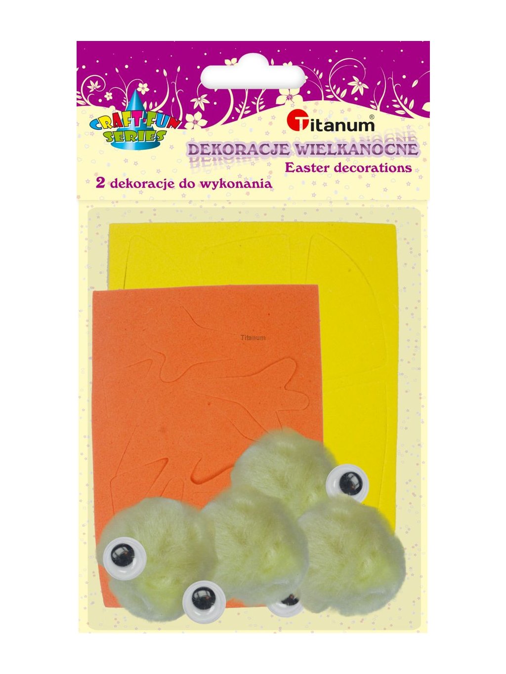 Z částí obsažených v balení složíte 2 dekorace. Samolepící pěnovka, bambulky (pompom) a očíčka.