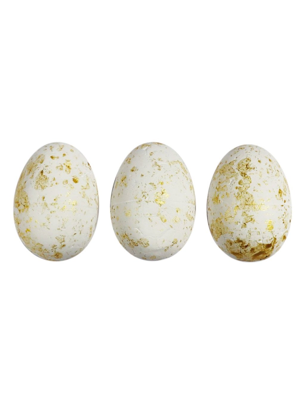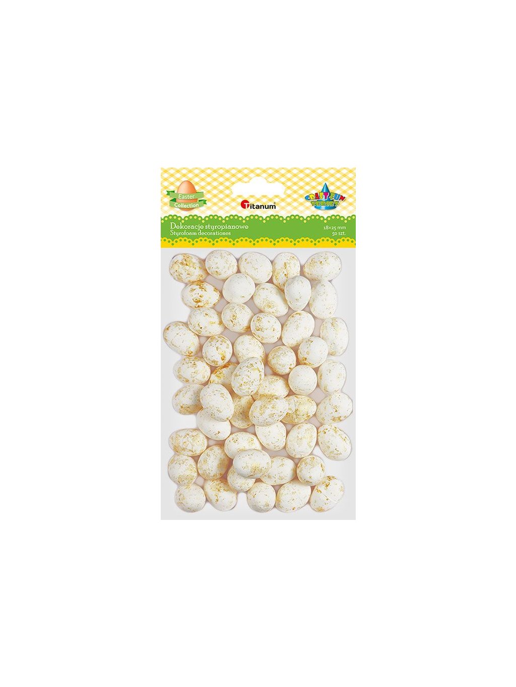 Polystyrenová vajíčka v bílé barvě se zlatým zdobením. Balení obsahuje 50 ks o velikosti 18×25 mm.