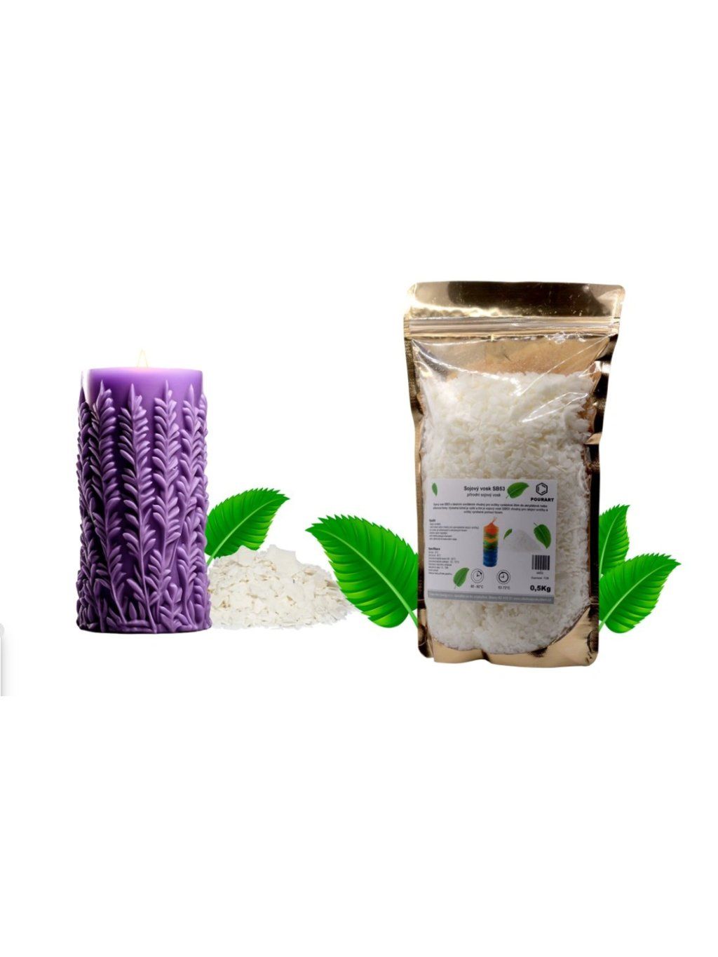 Sójový vosk SB53 s ideálním smrštěním vhodný pro svíčky vyráběné litím do akrylátové nebo silikonové formy. Výsledná tuhost je vyšší a tím je sójový vosk SB53 vhodný pro stojící svíčky a svíčky vyrobené pomocí forem.