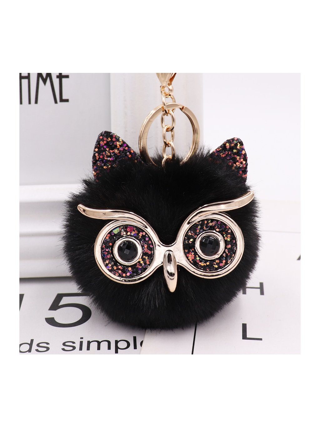 Přívěsek s karabinou, chlupatá bambule, SOVA - ČERNÁ, 12 cm, 1 kus