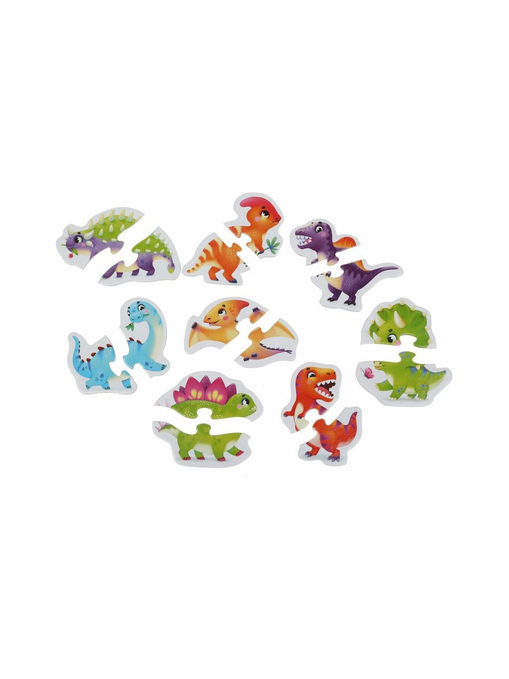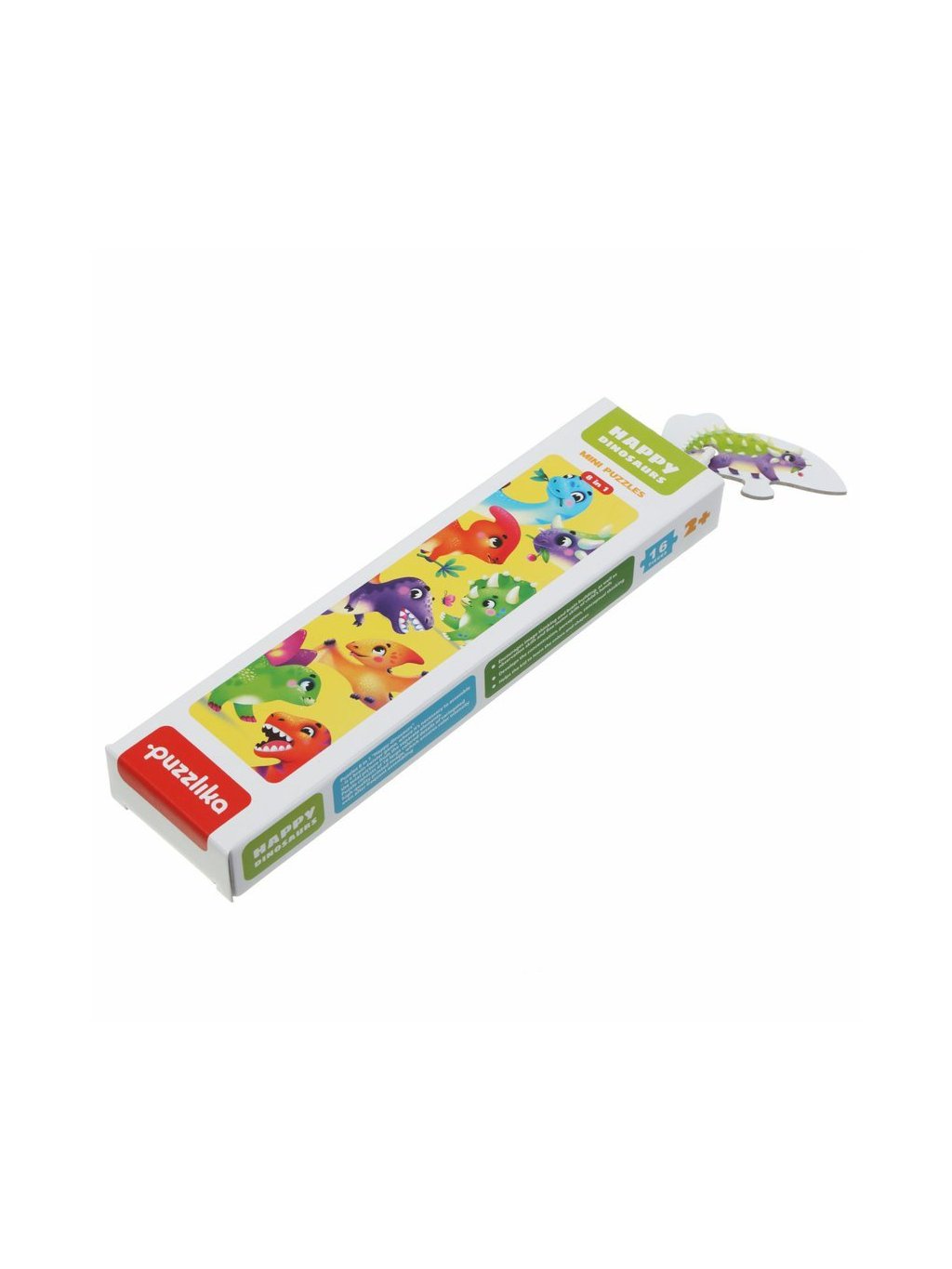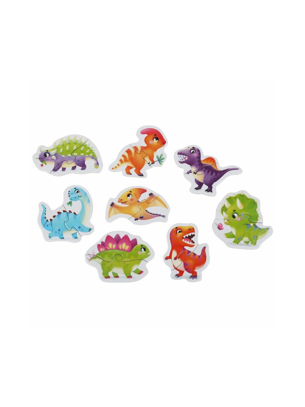 Puzzle Dinosauři obsahuje 16 velkých pevných puzzlů, ze kterých poskládáte 8 samostatných obrázků veselých dinosaurů.