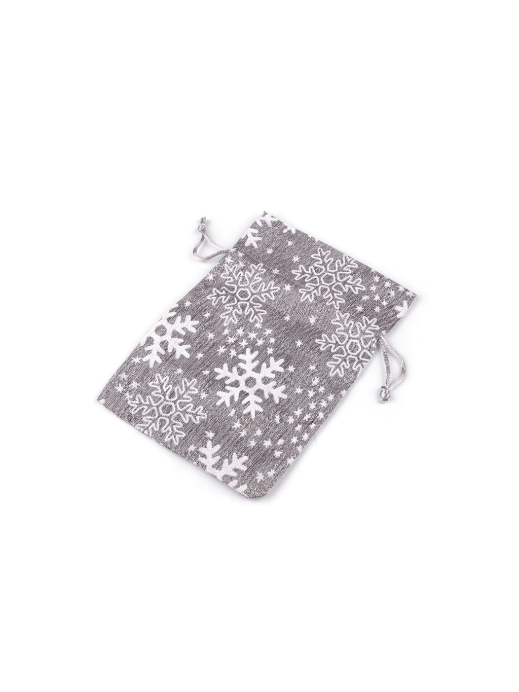 Vánoční pytlík zdobí potisk vloček. Snadno se uzavírá pomocí dvou stahovacích šňůrek. Je pevný.