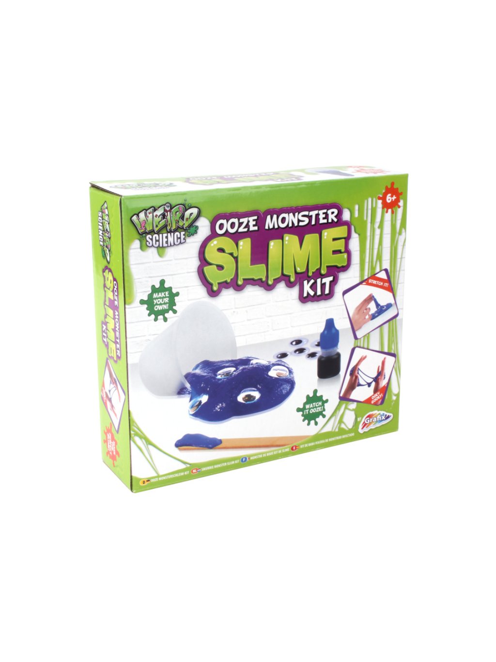 Obsahuje : 1 dřívko na míchání, 1 barevná přísada, odměrka, nádoba na uchování slizu, slizový prášek, voda na výrobu slizu, 10 očiček.