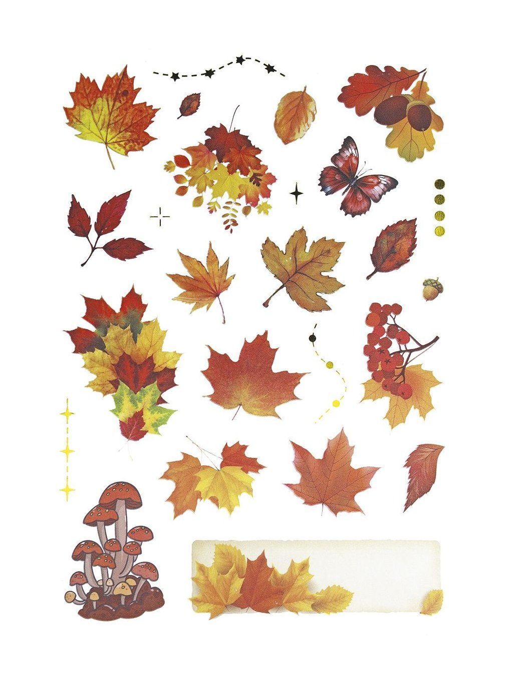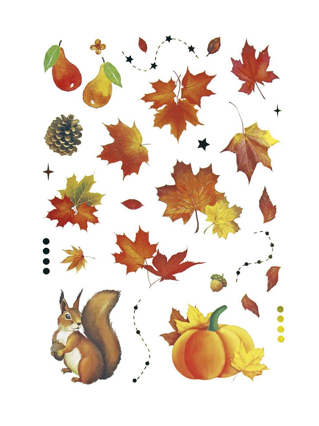 Bohatá sada fóliových samolepek s podzimní tematikou vnese do vašich projektů teplé barvy a kouzlo přírody. Najdete zde motivy dýní, listů, hub, žaludů, kaštanů i roztomilých zvířat, jako je veverka.