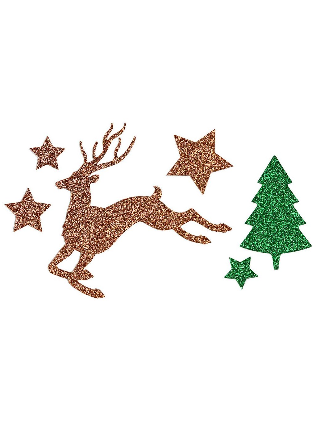 Třpytivé papírové samolepky s vánočními motivy – zelené stromečky, zlatí jeleni a hvězdičky v různých velikostech.