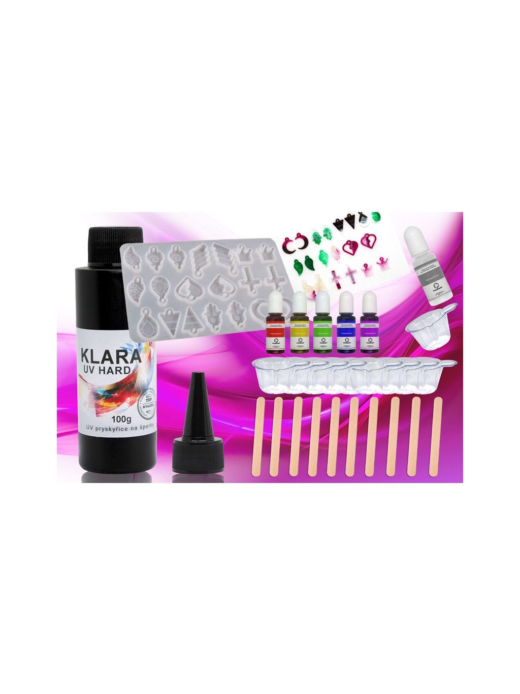 Startovací sada s UV pryskyřicí Náušnice I je vhodná nejen pro začátečníky. Sada obsahuje kvalitní UV pryskyřici, potřebné pomůcky a silikonovou formu na náušnice. Sada je doplněna základními barvami pro průhledné probarvení výrobků včetně bílé barvy a pro zdobení jsou zde k dispozici fialové glitry.