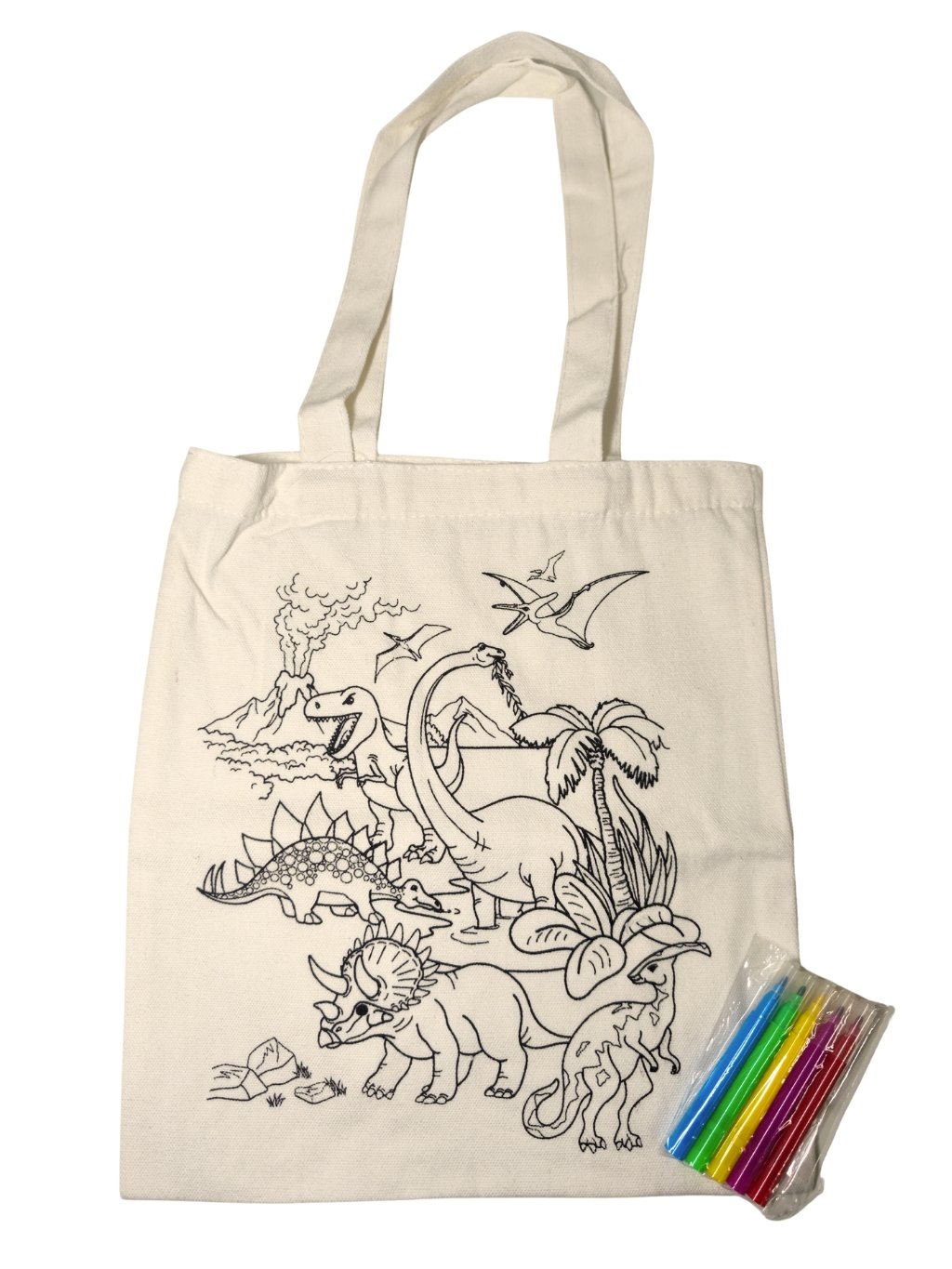 Taška plátěná k vybarvení, DINOSAUŘI, béžová, 25x30cm, 5 fixů, 1 sada