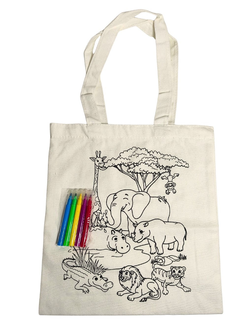Taška plátěná k vybarvení, ZVÍŘÁTA ZE SAFARI, béžová, 25x30cm, 5 fixů, 1 sada