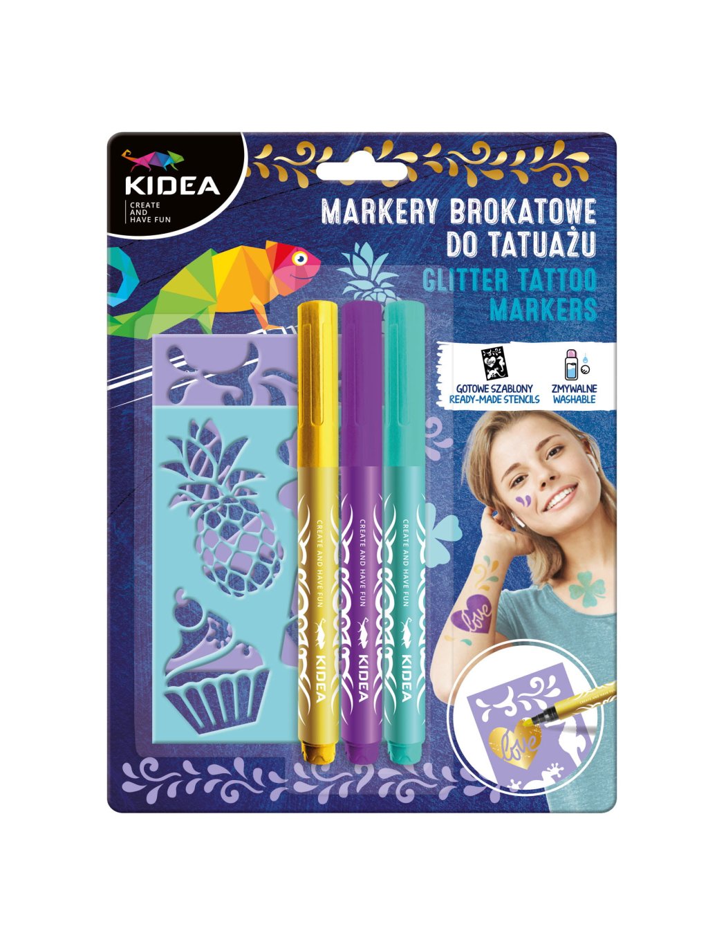 - Balení obsahuje tři třpytivé fixy: fialový, tyrkysový a zlatý a dva archy se šablonami.