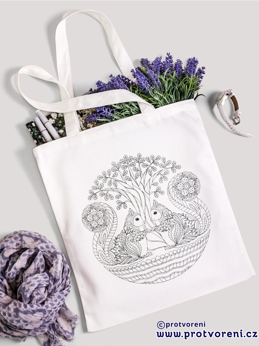Textilní taška, k vybarvení, bílá, VZOR DVĚ VEVERKY, 1kus