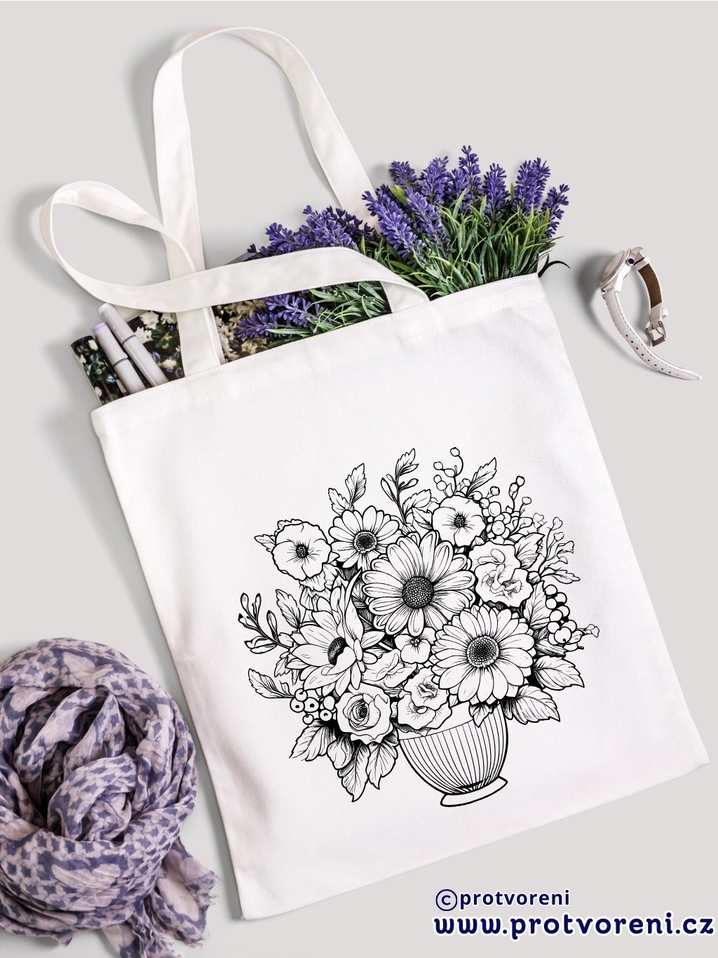 Textilní taška k vybarvení, KVĚTINY VE VÁZE, 41x37cm, BÍLÁ, 1 kus
