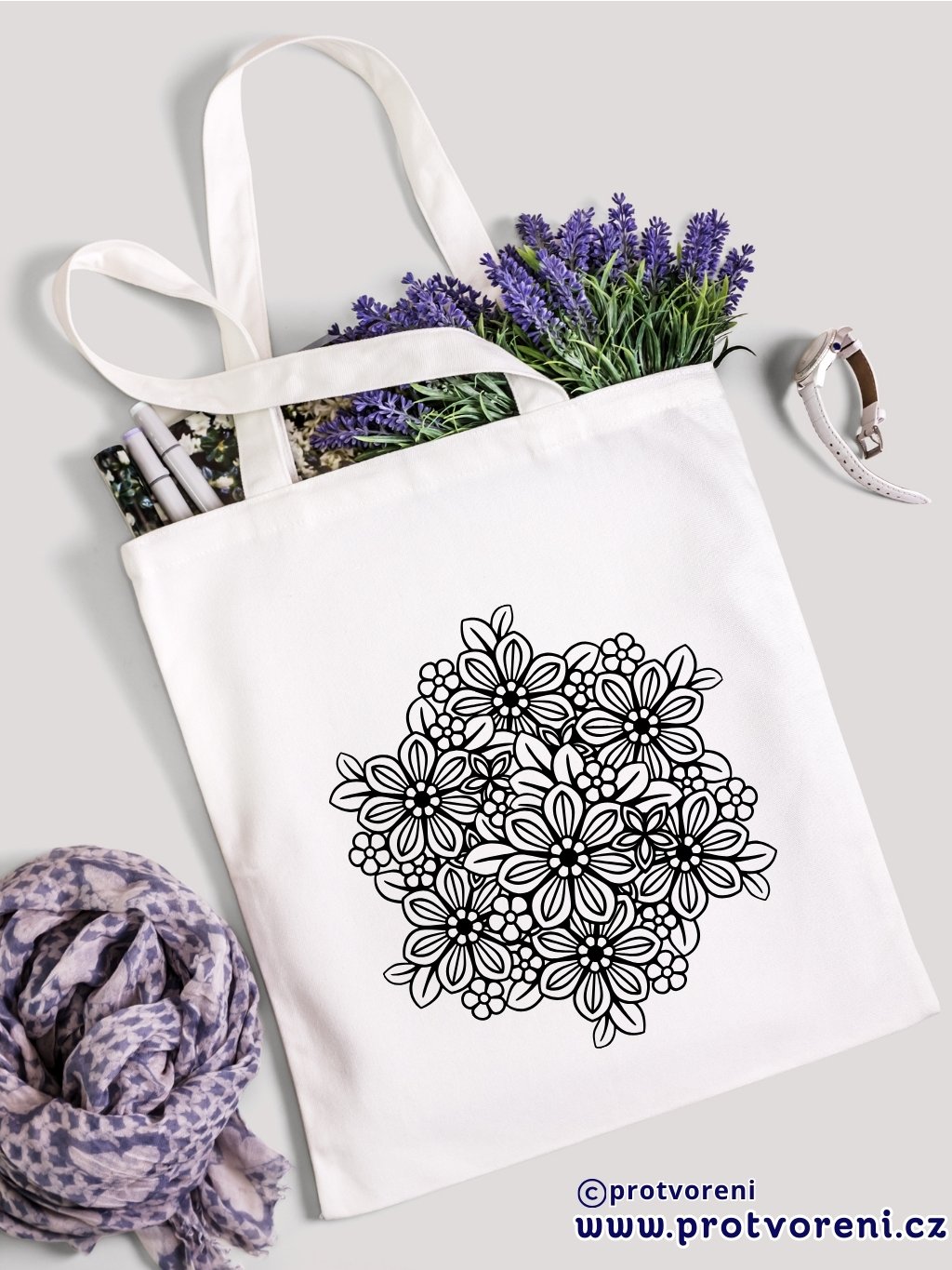 Textilní taška k vybarvení, MANDALA - KVĚTY 1, 41x37cm, BÍLÁ, 1 kus