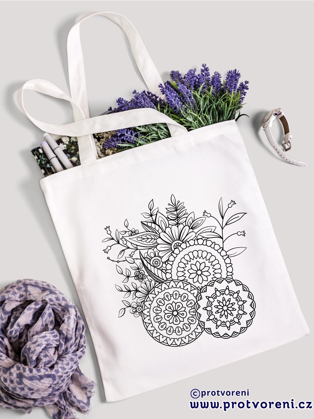 Textilní taška k vybarvení, MANDALY A KVĚTINY, 41x37cm, BÍLÁ, 1 kus
