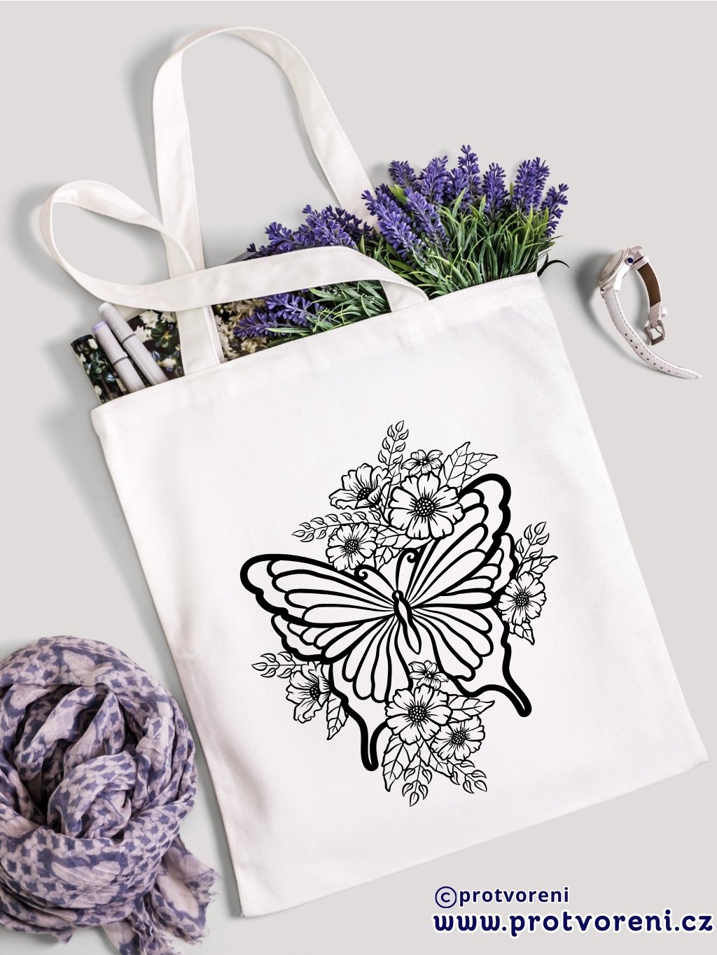 Textilní taška k vybarvení, MOTÝL V KVĚTINÁCH, 41x37cm, BÍLÁ, 1 kus